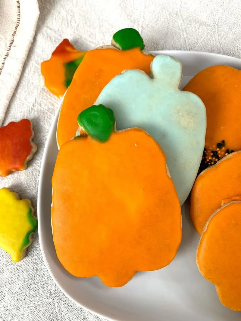 I love these spiced sugar cookies for Halloween, for Thanksgiving, or really any fall gathering. They’re pretty, they’re fun and they’re delicious. Not too spiced. Not crispy but not too soft. Just about the perfect sugar cookie.